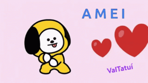 Cartoon character Chimmy blowing hearts, with text 'AMEI' and 'ValTatuí' on a light pink background.