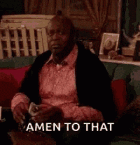 A man on a couch gestures emphatically with the caption "Amen to that", expressing strong agreement.