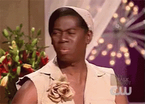 Miss J Alexander makes a disgusted face on America's Next Top Model, wearing a unique outfit.