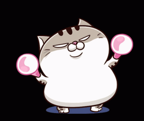A cute, chubby cartoon cat, Ami Fat Cat, with pink eyes and paws, cheering happily.