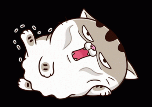 Ami Fat Cat, a cartoon feline, lies on its back with its mouth wide open, looking tired or hungry.