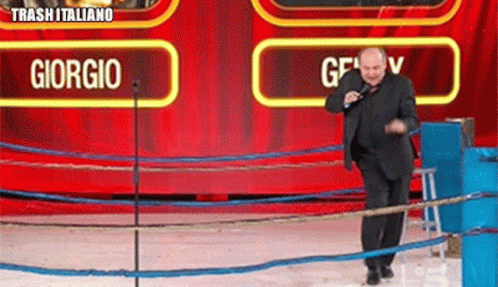 Gerry Scotti shows off his dance moves, including mambo, in a boxing ring on Amici Speciali.