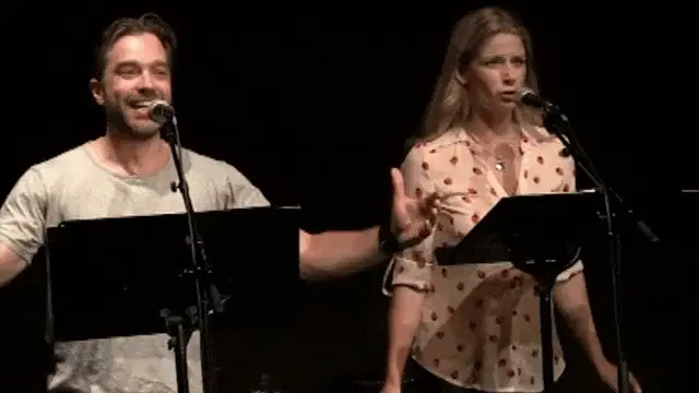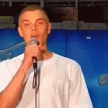 Simone Baldasseroni, a singer from Amici17, performs into a microphone against a blue background.