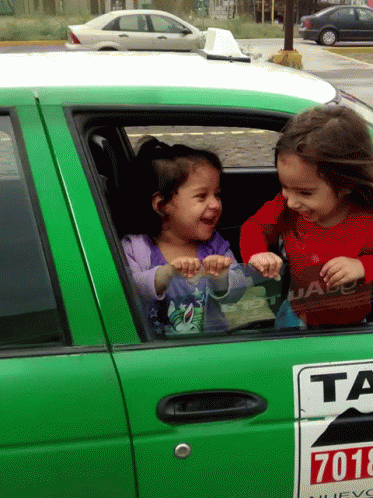 Two happy girls laughing and playing in a green taxi, enjoying their ride and leaning out the window.