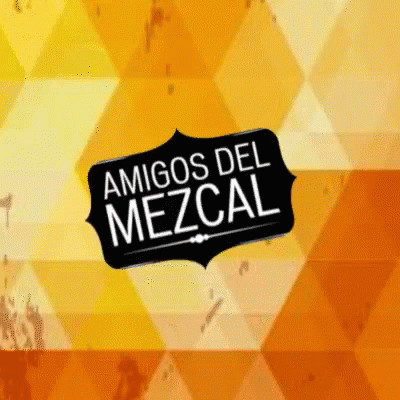 The 'Amigos Del Mezcal Charlyna' logo animates and spins on a vibrant orange and yellow geometric background.