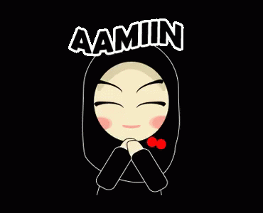 A cheerful cartoon character wearing a black hijab, with the text 'Amin' displayed, expressing gratitude or prayer.