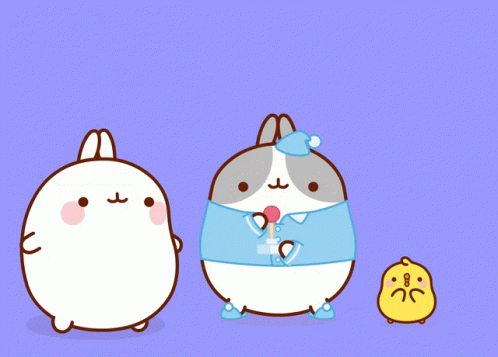Molang, Pincou, and Piu Piu dance happily, with Pincou holding a lollipop in blue pajamas.