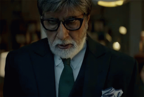 Amitabh Bachchan, wearing glasses and a suit, gives an intense, serious stare from the film Badla.