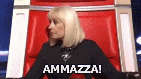 Raffaella Carrà reacting with 'AMMAZZA!' while sitting in a red chair.