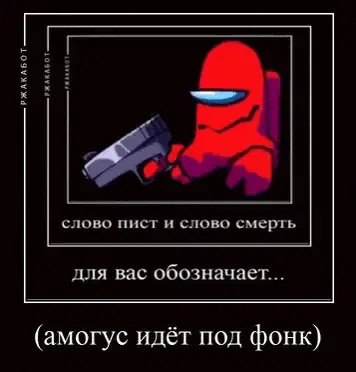 A red Among Us character, known as Amogus, holds a gun, with Russian text about 'pist' and 'death'.