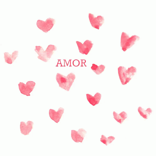 A white background with watercolor pink hearts and the word 'AMOR' in red.