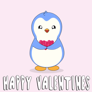 An adorable animated penguin with red cheeks and wings wishes 'Happy Valentines' on a light pink background.