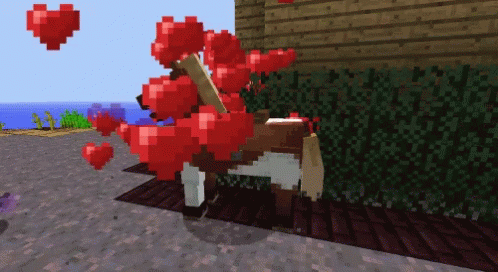 A Minecraft horse is surrounded by red heart particles, signifying love or successful taming in the game.