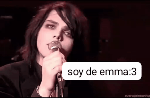 Gerard Way of My Chemical Romance singing into a microphone, with a speech bubble saying 'soy de emma :3'.