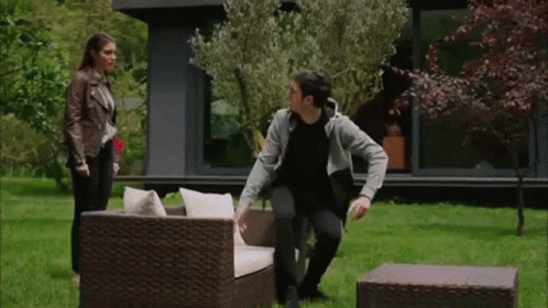 Hazan Çamkiran and Yagiz Egemen, played by Deniz Baysal and Caglar Ertugrul, share a heartfelt hug in a garden.