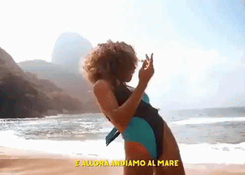 Giusy Ferreri performs 'Amore E Capoeira' on a beach, with lyrics 'Andiamo al mare' and 'In mezzo a un temporale'.