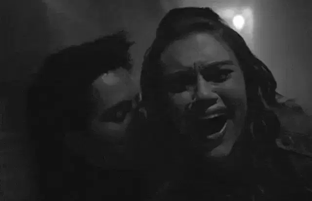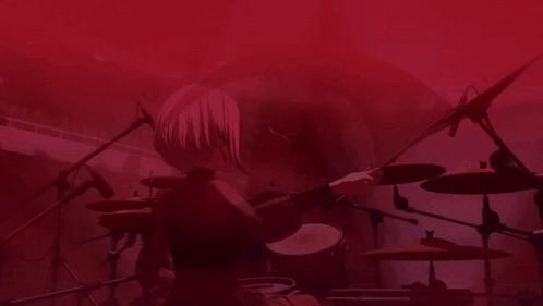 a woman is playing drums in a dark room with a red background .