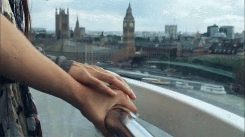 A person's hands rest on a railing, overlooking the iconic London cityscape with Big Ben and the Houses of Parliament.