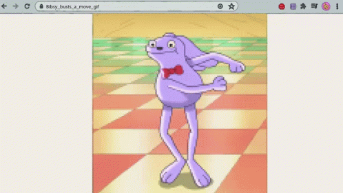 Bibsy, the purple frog-like character from Amphibia, busts a move on a checkered floor.