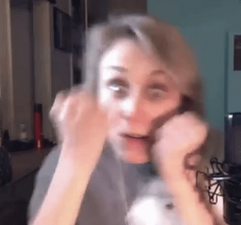 Amy Vorpahl makes a funny, punchy 'tsts' expression, mimicking boxing movements with wide eyes and an open mouth.
