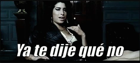 Amy Winehouse in a leather jacket, with the Spanish caption 'Ya te dije qué no' (I already told you no) displayed.