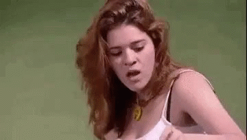 Ana Clara Bbb yawns widely, looking sleepy in a white tank top against a plain green background.
