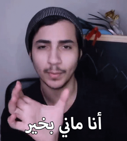 Man in beanie expresses feeling unwell, with Arabic text 'I am not well' on screen, reflecting his tired state.