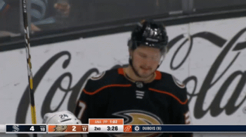 Anaheim Ducks player Mason McTavish celebrates a power play goal with his teammates on the ice.