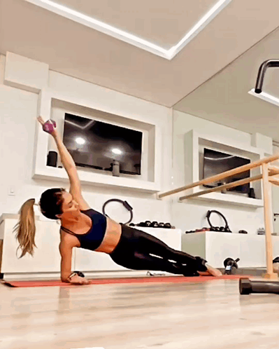 Anahi (RBD) performs a challenging plank workout, including side planks with leg raises and exercise ball planks.