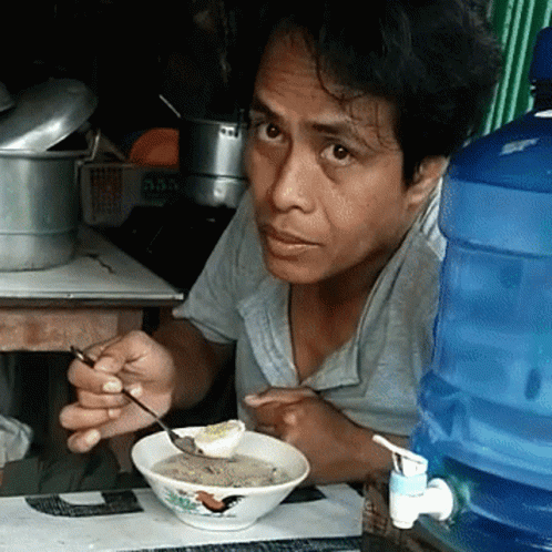 Anak Landak, a man, is startled while eating a bowl of porridge (bubur) at a simple food stall.