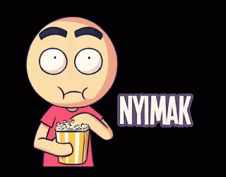 Anak Yimyam watches intently, eating popcorn, with the Indonesian word 'NYIMAK' displayed.