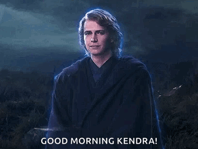 Anakin Skywalker appears as a glowing Force Ghost, smiling and saying 'Good Morning Kendra!' in a misty landscape.
