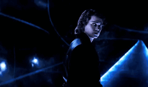 Anakin Skywalker stands in a dark, mysterious setting, illuminated by an ominous blue light, contemplating his fate.
