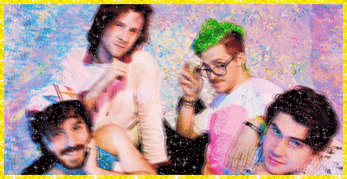 The band Anamanaguchi posing for a vibrant, stylized portrait with a glitter effect and a yellow border.