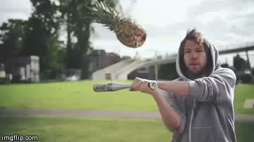 Apecrime member smashes a pineapple mid-air with a baseball bat, resulting in an explosive impact.