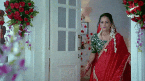 Anant Saathiya's Gehna, wearing a red saree and traditional jewelry, walks into a beautifully decorated room.
