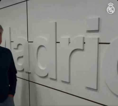 Carlo Ancelotti stands in front of a wall with 'Madrid' written on it, likely at a Real Madrid facility.