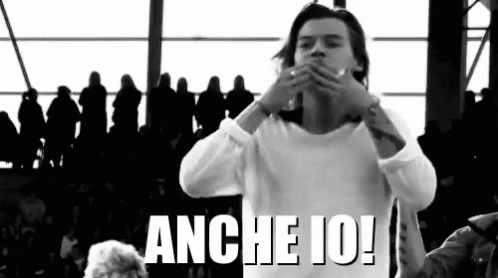 Harry Styles from One Direction reacts with 'Me too!' gesture in front of a crowd.