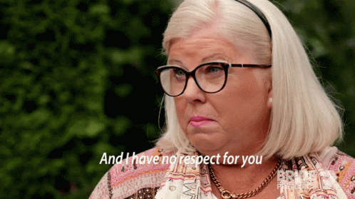 An older woman with blonde hair and glasses sternly states, 'And I have no respect for you.'