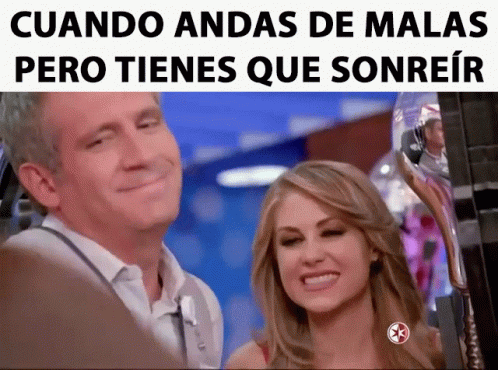 Arath De La Torre and Ingrid Martz show a forced smile, embodying the meme 'When you're in a bad mood but have to smile.'