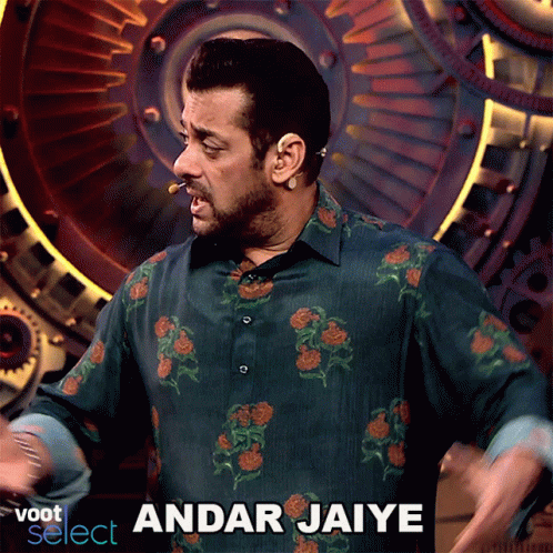 Salman Khan, wearing a floral shirt, gestures while saying 'Andar Jaiye' on the set of Bigg Boss.