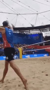 Anders Mol, wearing his number 1 jersey, celebrates a point on the sand court during a beach volleyball match.