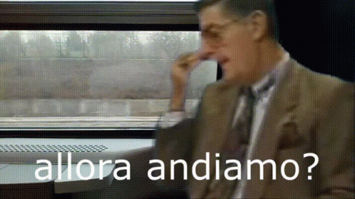 Germano Mosconi asks 'So, shall we go?' and then responds 'Okay.' while sitting on a train.