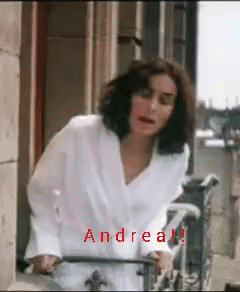 Andrea leans over a balcony railing, looking down and possibly calling out in an urban setting.