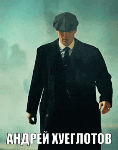 Andrey Shelby, a man in a suit and hat, walks with the text 'АНДРЕЙ ХУЕГЛОТОВ' displayed.
