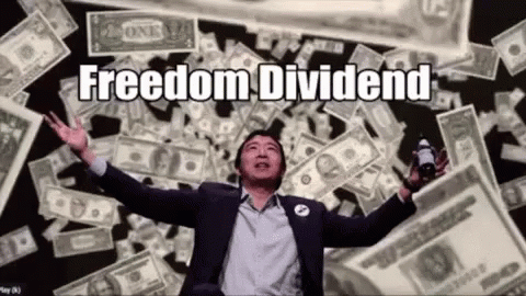 Andrew Yang celebrates the Freedom Dividend with money falling around him, holding a bottle.