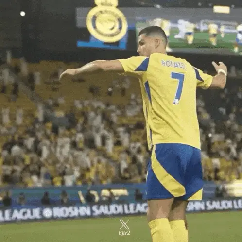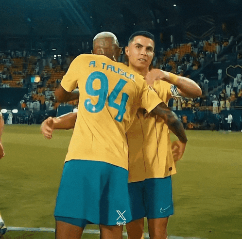 Cristiano Ronaldo and Anderson Talisca share a celebratory hug on the soccer field during a match.