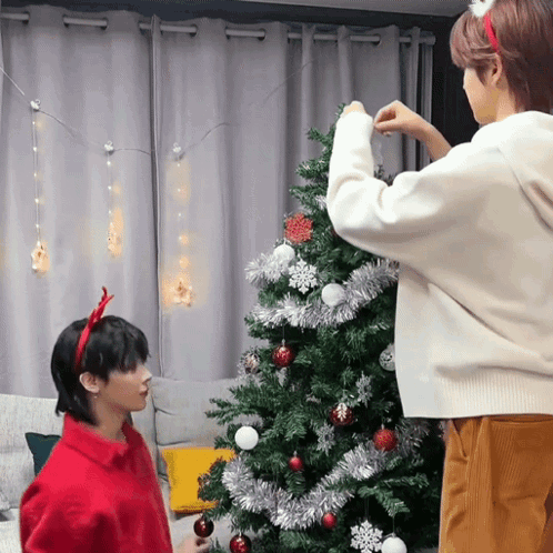 Andteam Ej and Nicholas decorate a Christmas tree, showing off their festive spirit with thumbs up.