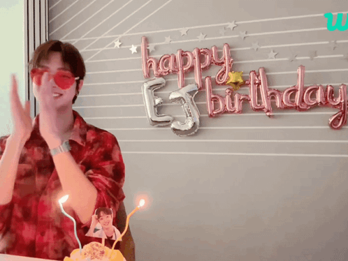 Andteam EJ celebrates his 22nd birthday, clapping happily in red sunglasses in front of a 'Happy Birthday EJ' banner.