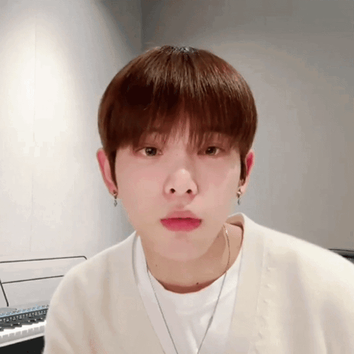 Andteam Harua makes a cute pouting face during a Weverse live, wearing a white shirt and cardigan.